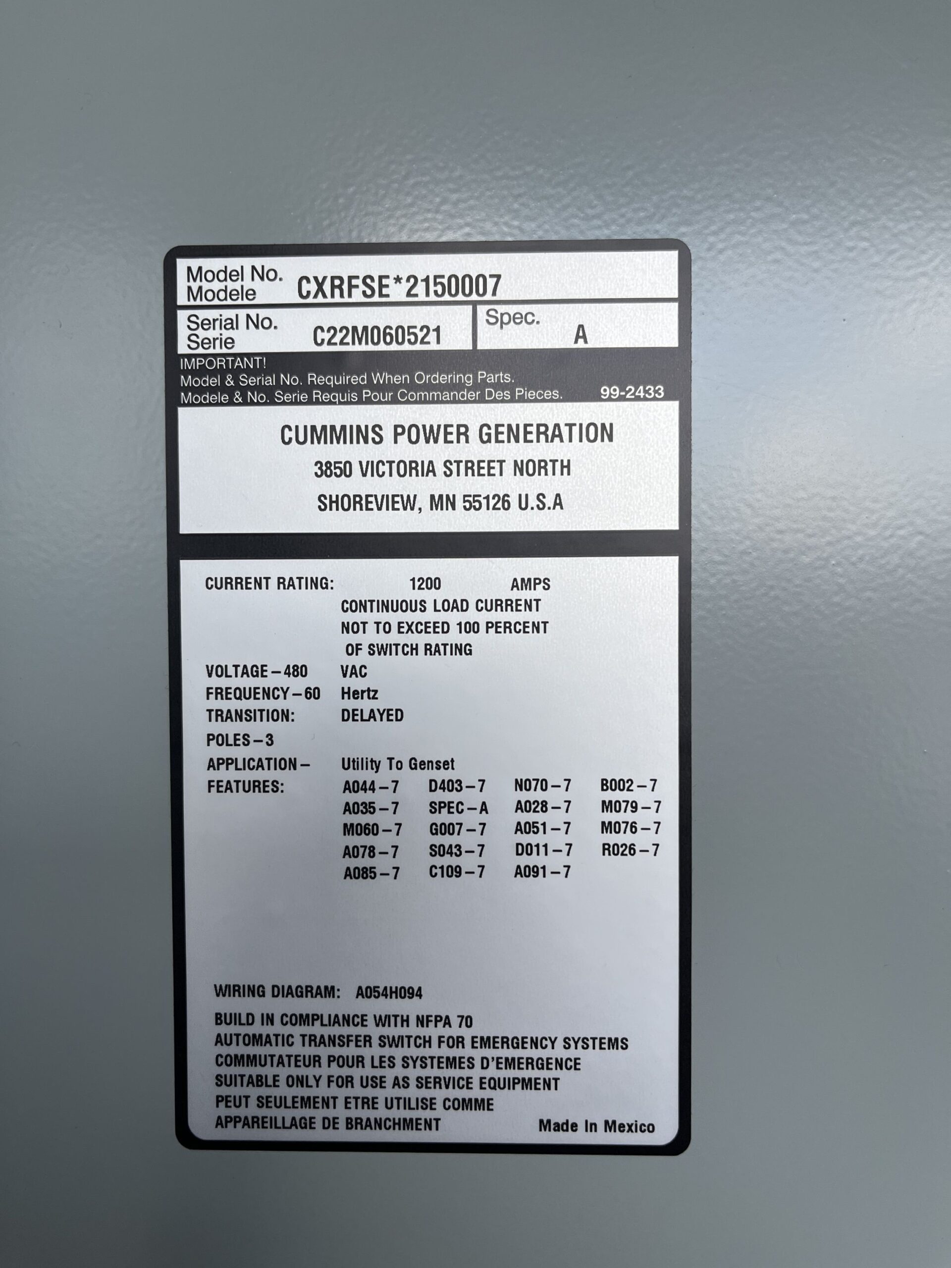 NEW 1200 Amp Cummins CXRFSE Automatic Transfer Switch – S/N: C22M060521