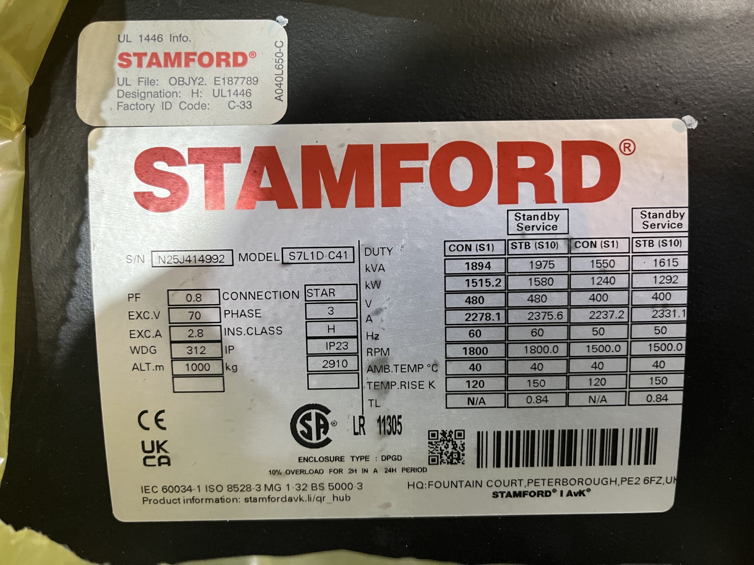 1500kW (1894kVA) Stamford S7L1D-C41 Alternator